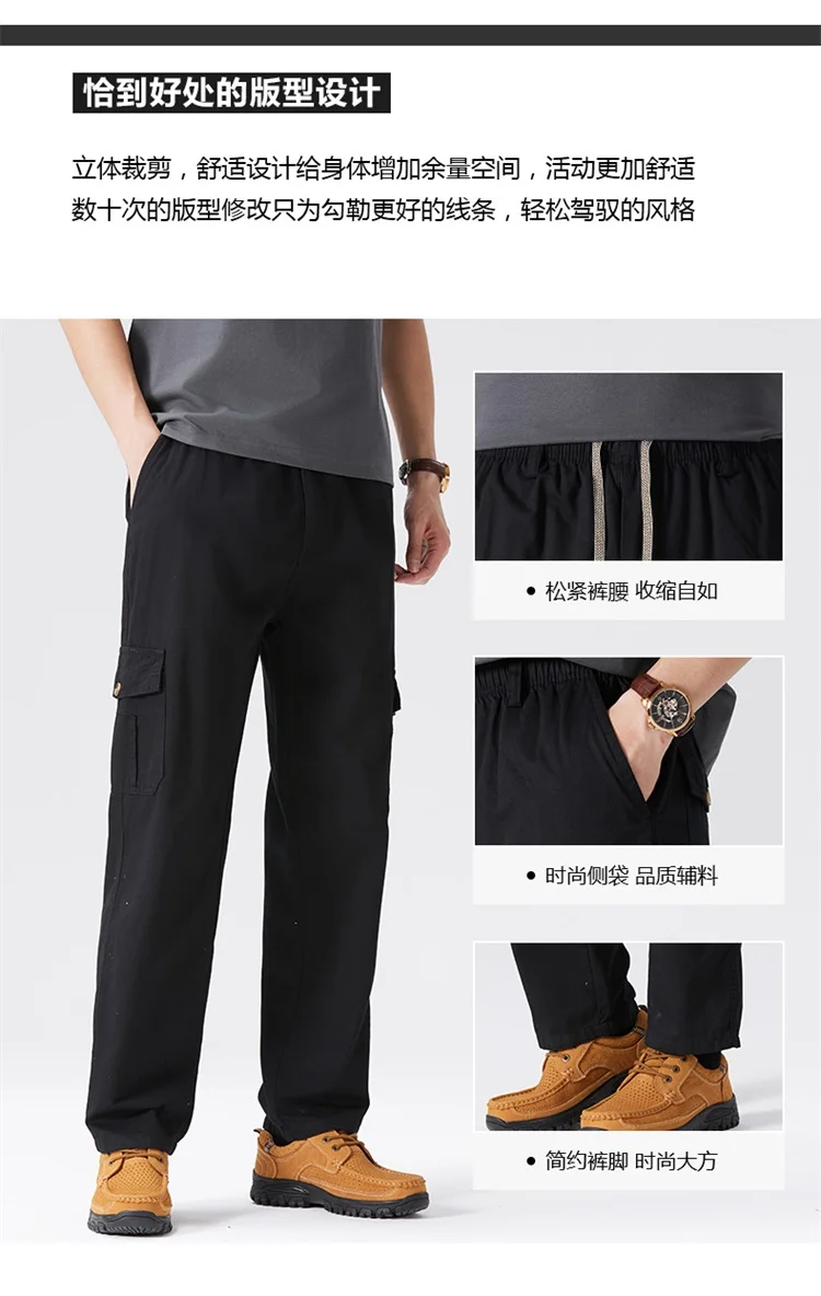 100% Cotton Men's Cargo Pants Straight Fit Loose Work Trouser Male Spring Summer High Waist Big Size Large Plus Elastic Pocket