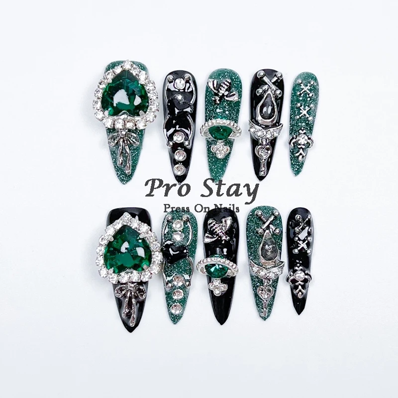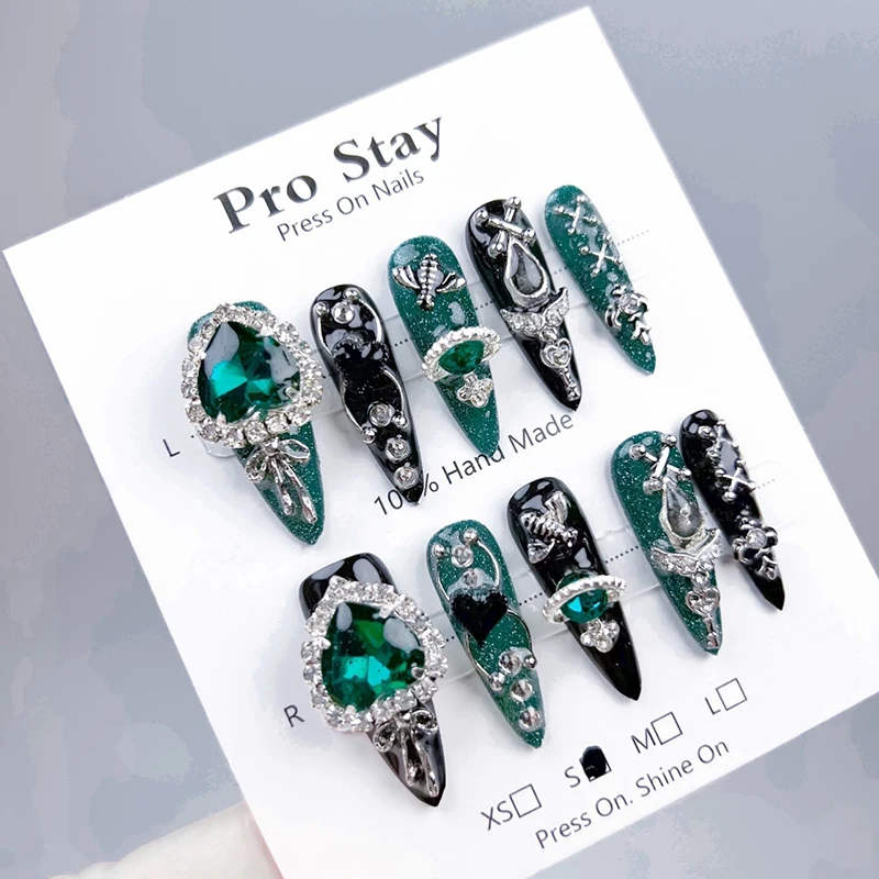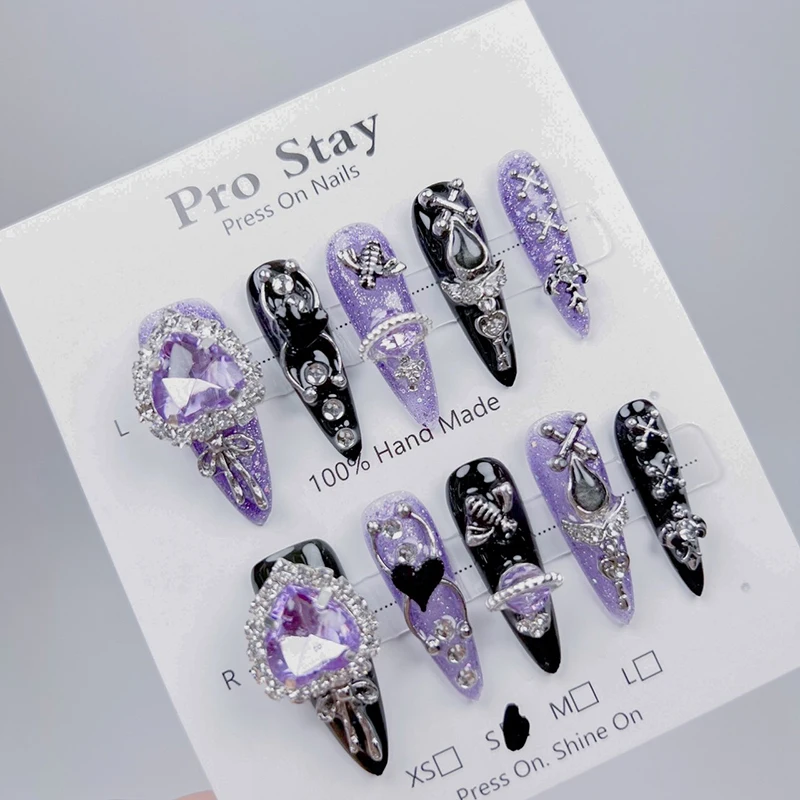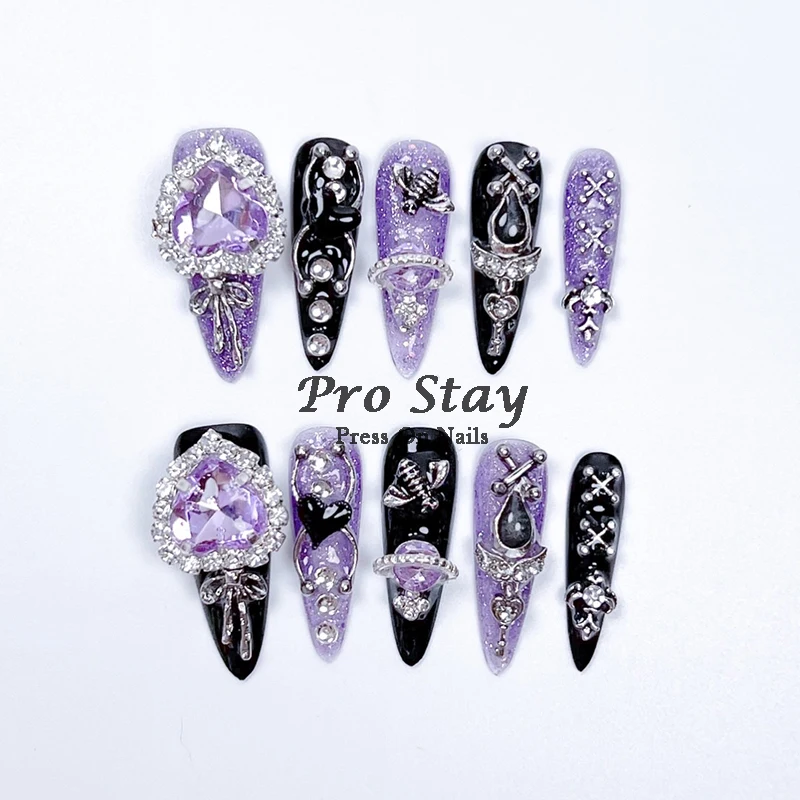 10Pcs Y2K Handmade Press On Nails Black Blue Heart Cross Designs for Parties Weddings Daily Wearable Artificial False Nail