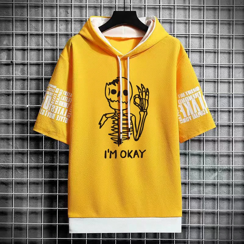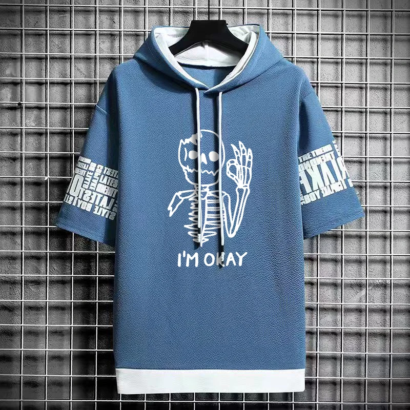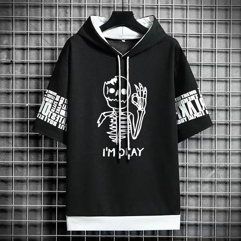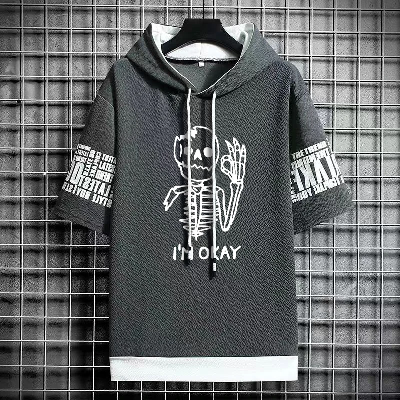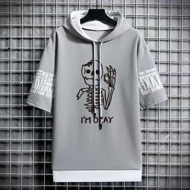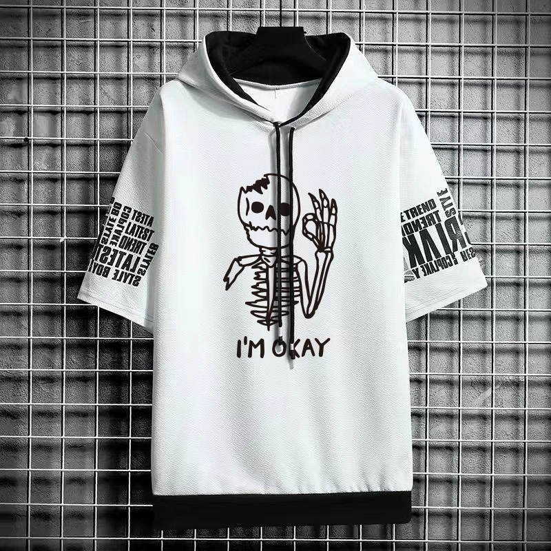 2024 Summer Men Clothing Men's Sweatshirts Korean Fashion Harajuku Short Sleeve Hoodies Men Streetwear Print Skulls Hoodies Men