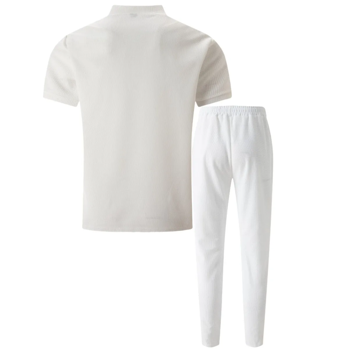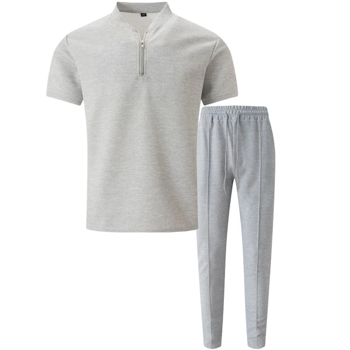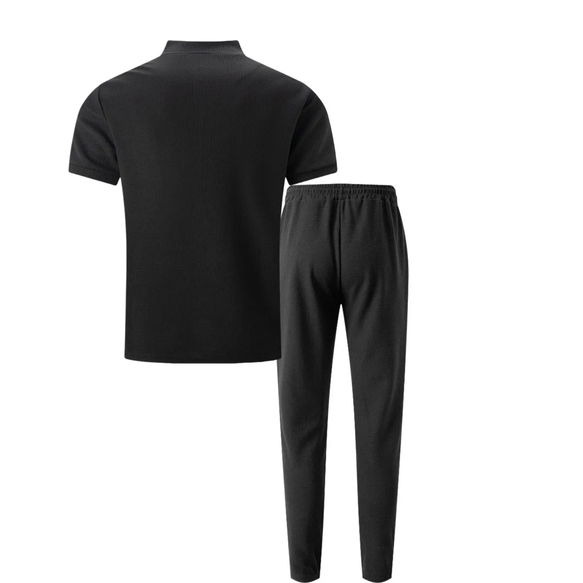 2025 Men's new waffle collar small zipper solid color polo shirt top men's T-shirt short sleeve trousers two sets - Clikcy