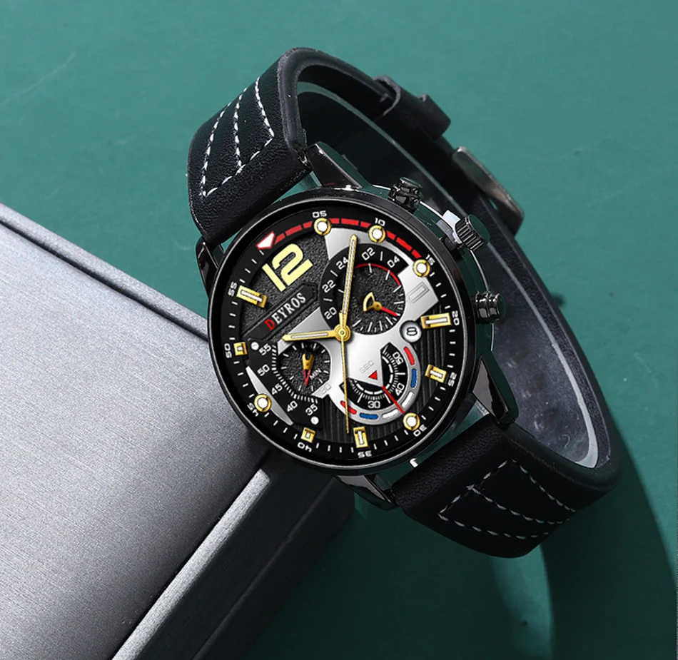 • Luxurious Black Leather Strap :The DEYROS men's watch features a luxurious black leather strap, adding a touch of sophistication to your business casual attire.