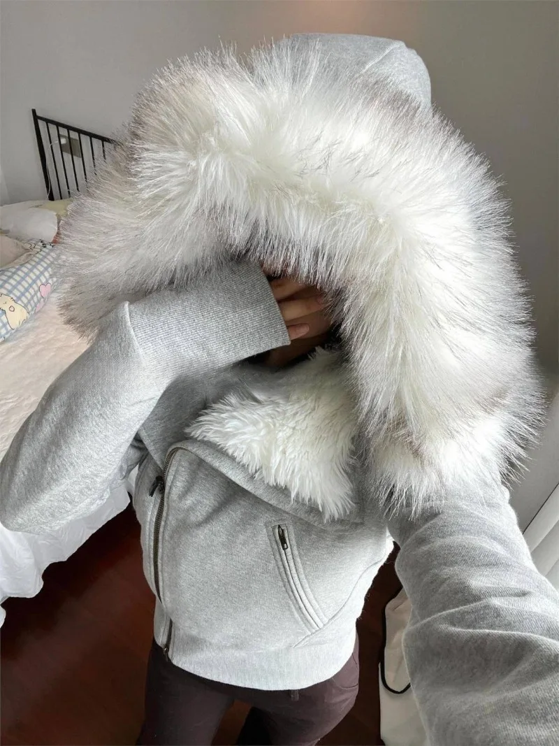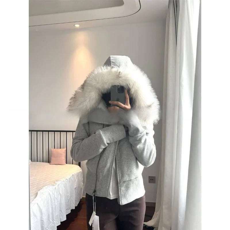 American Fashion Trend New Gray Padded Hooded Sweater Coat Female Y2K Harajuku Vintage Popular Casual Joker Zipper Cardigan