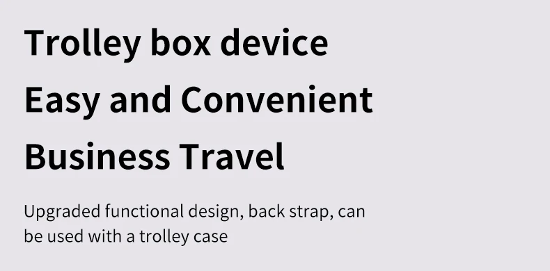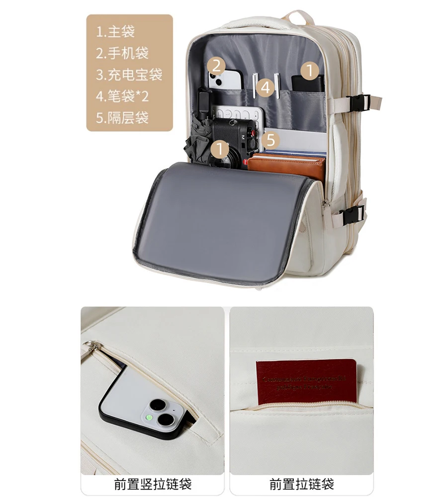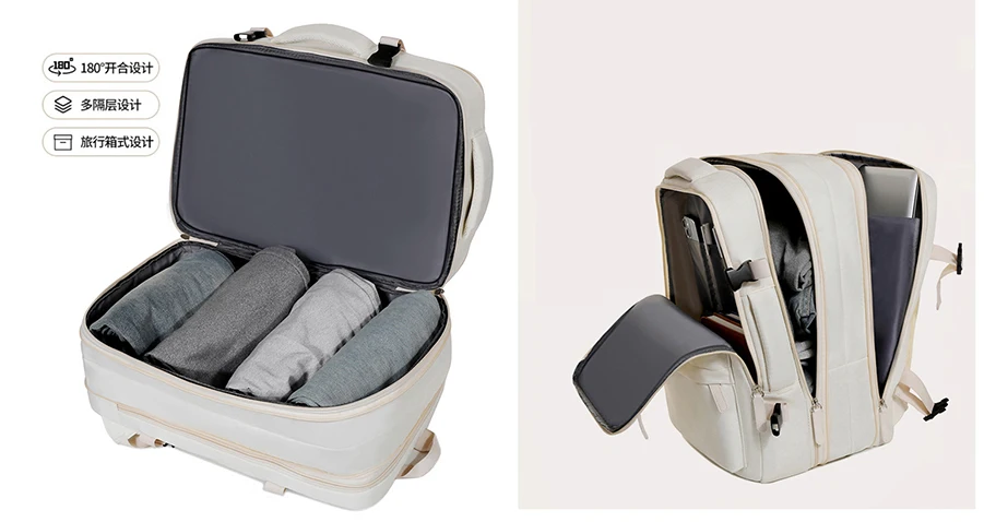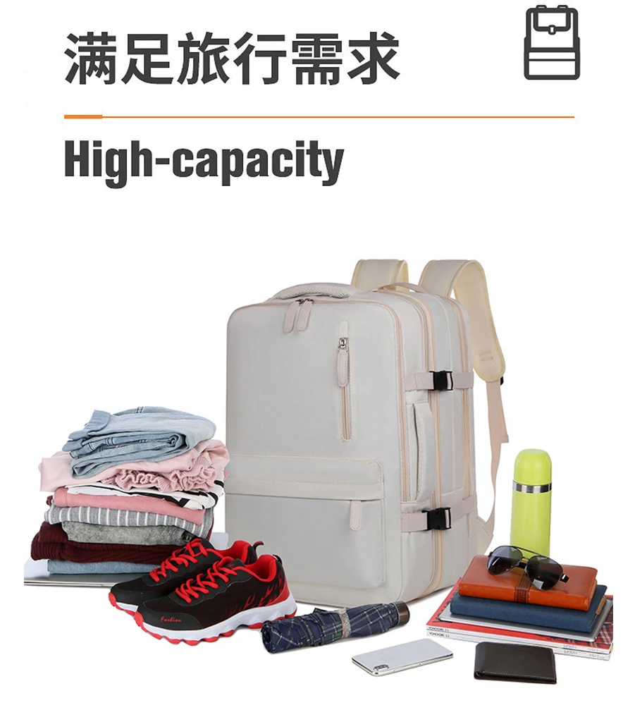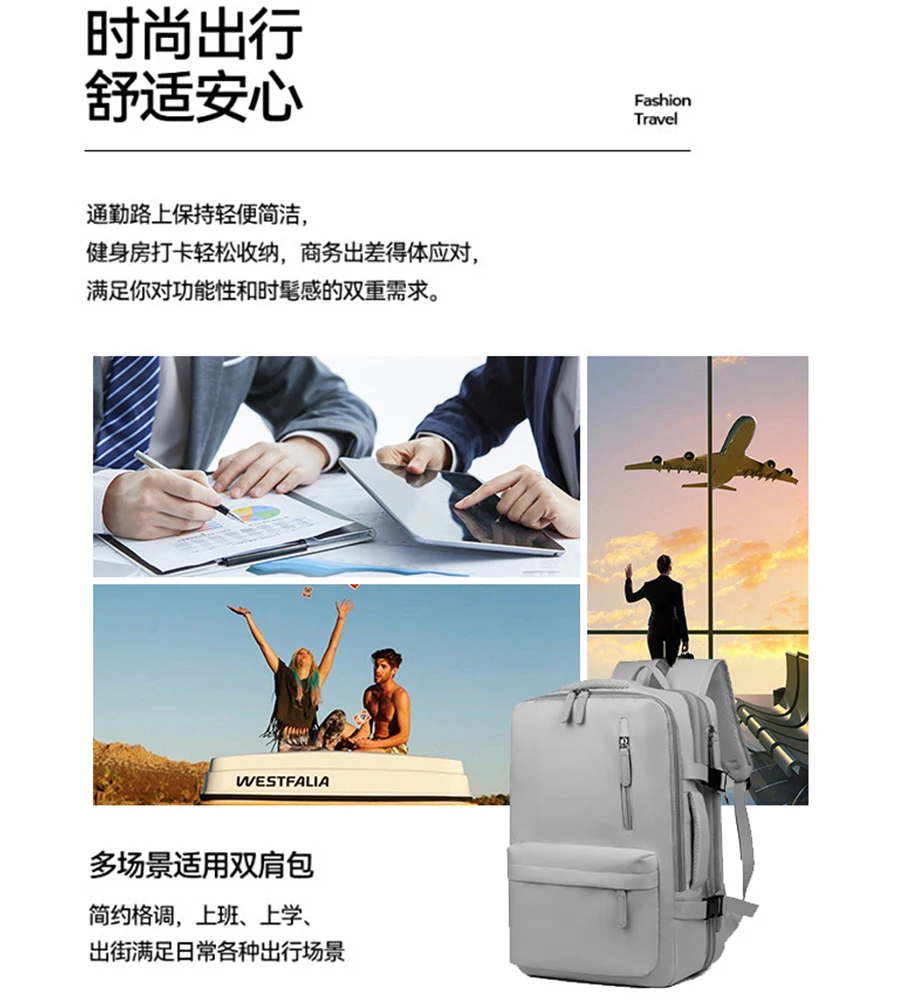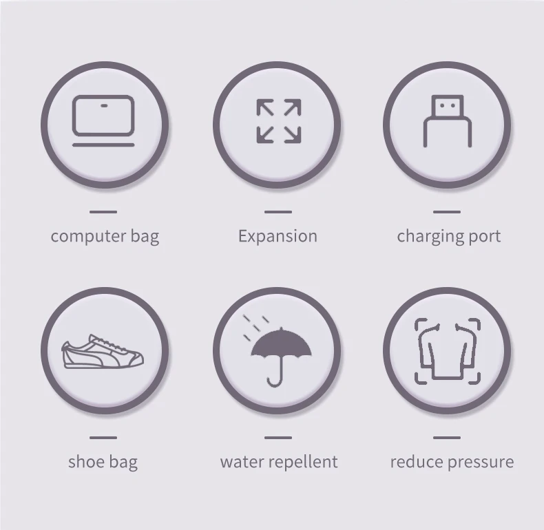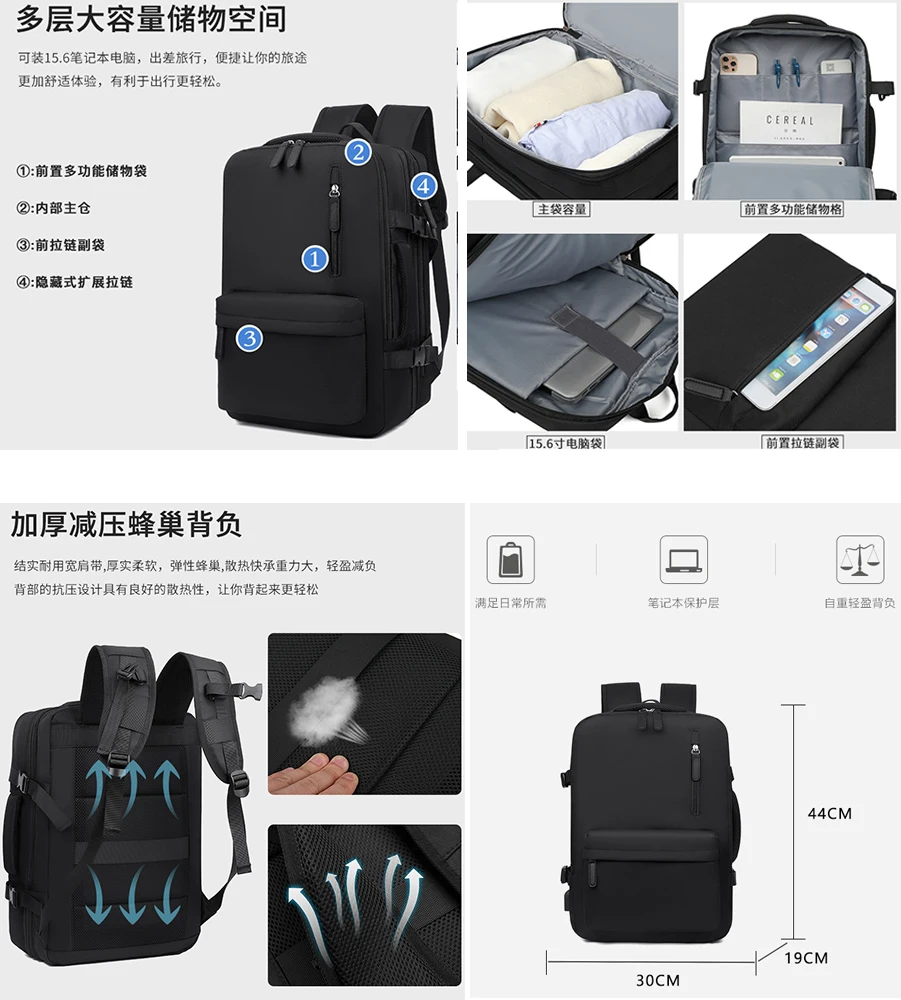 Structure: Front zipper bag*2, wet and dry separation bag, independent shoe bag, side insulation bag*2, anti-theft zipper bag, main bag, independent laptop bag