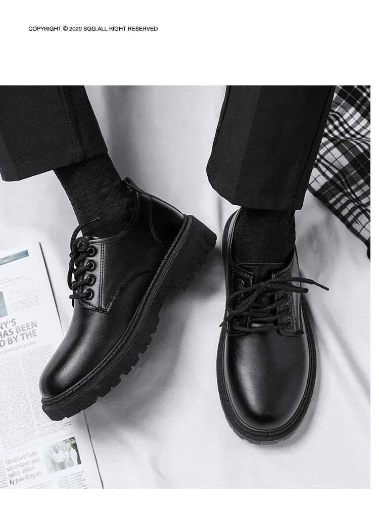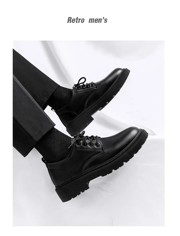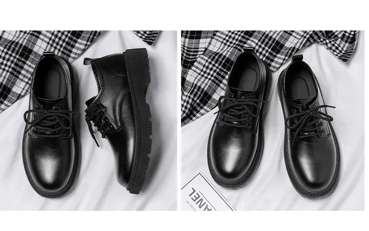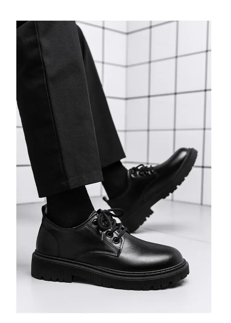 Casual Men's Pure Black Lace-up Height-increasing Business-style Low-heeled, Comfortable and Durable Small Leather Shoes