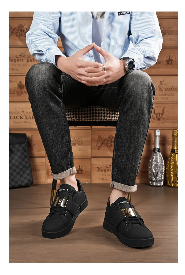 HKDQ Classic Black Sneakers For Men Fashion Design Leather Casual Sneakers Man Street Style Comfortable Men's Skateboard Shoes
