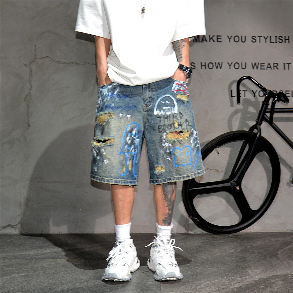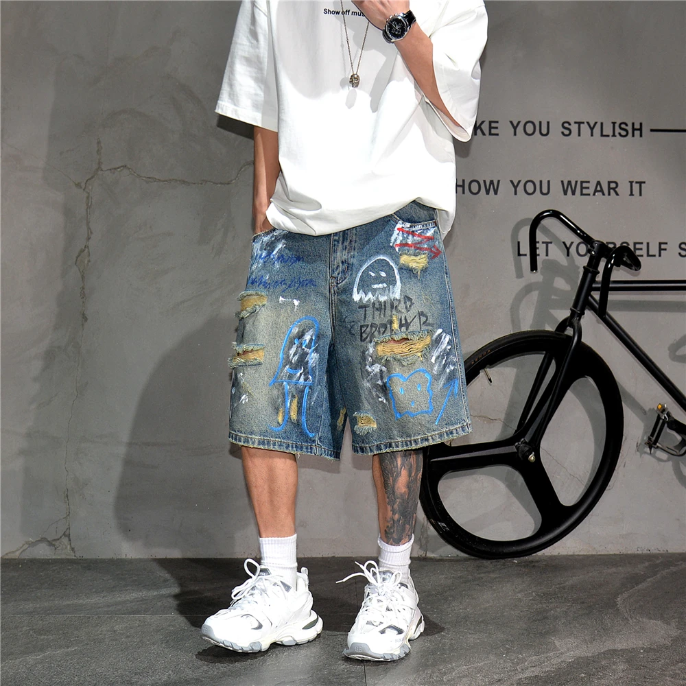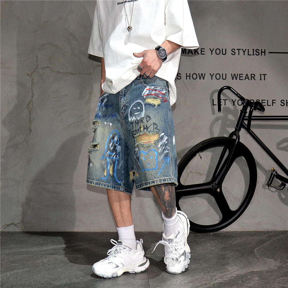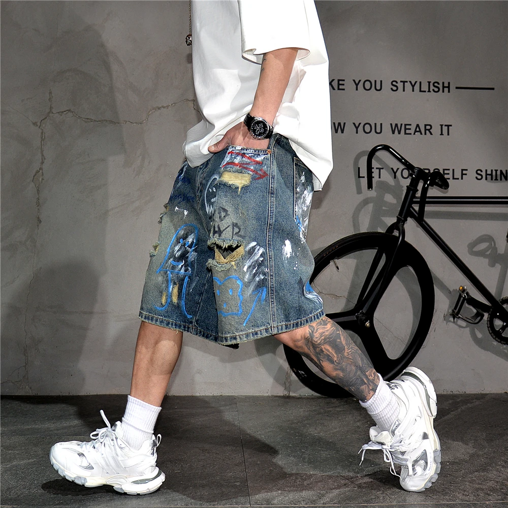 Mens Summer Ripped Distressed Denim Shorts 5 Inch Korean Style Streetwear Hip Hop Graffiti Skate Trendy Mid Blue jorts Male
