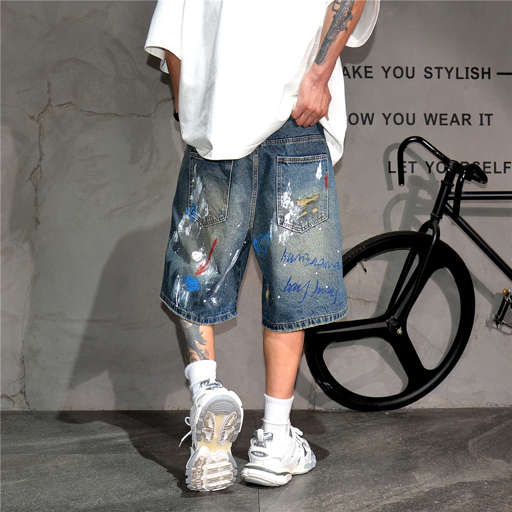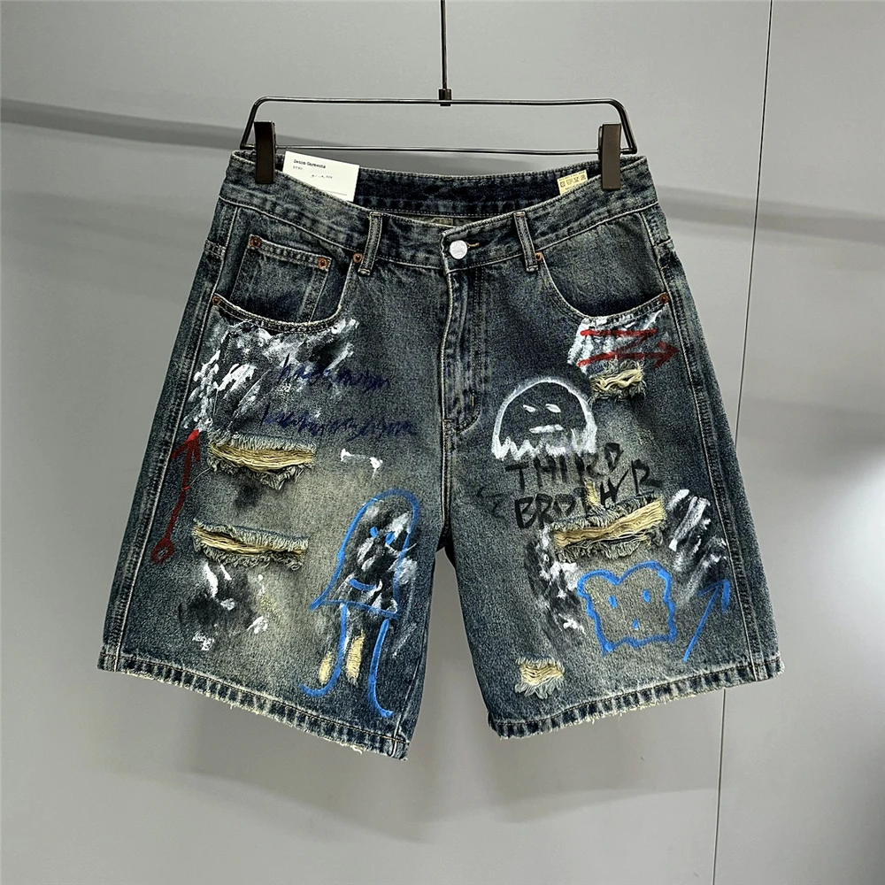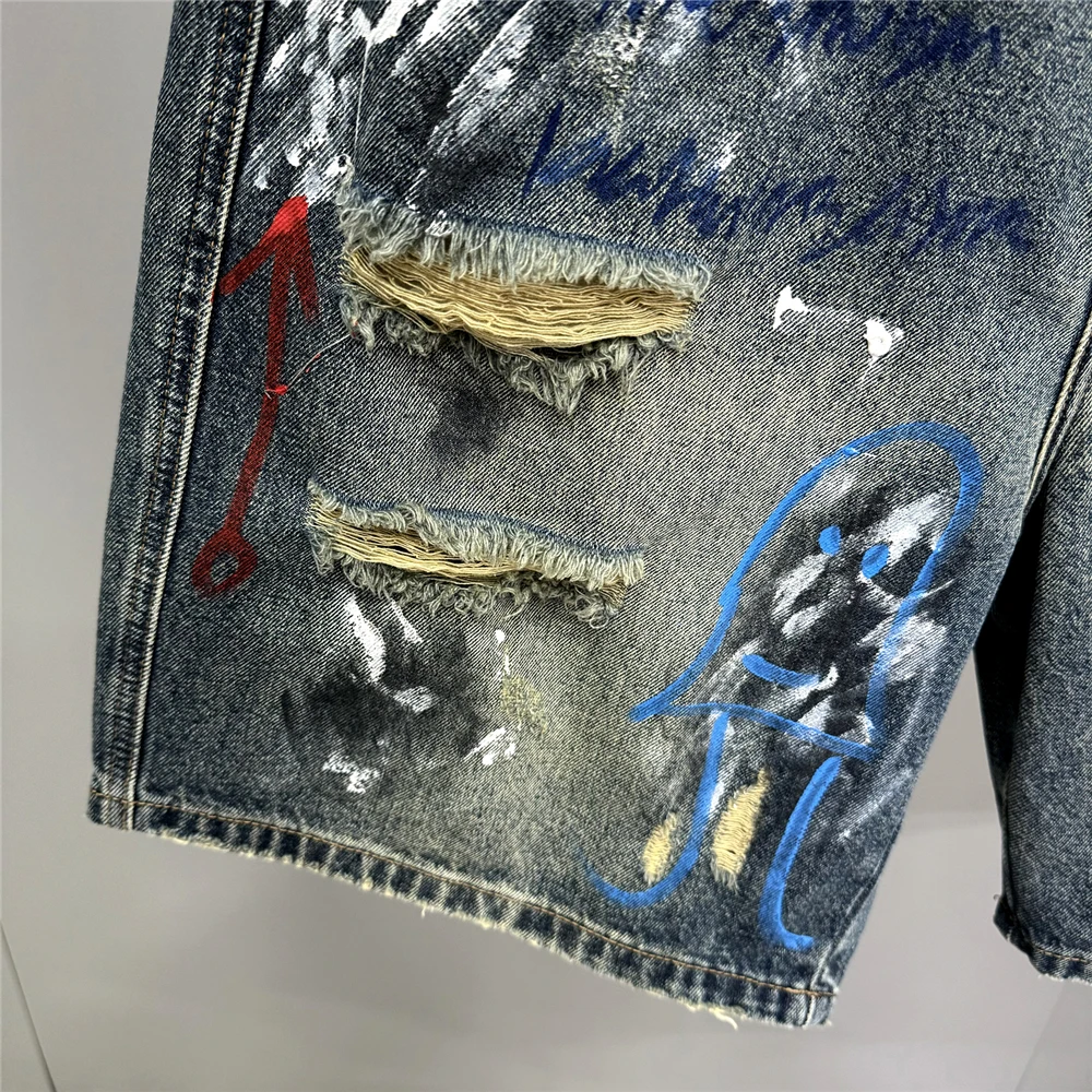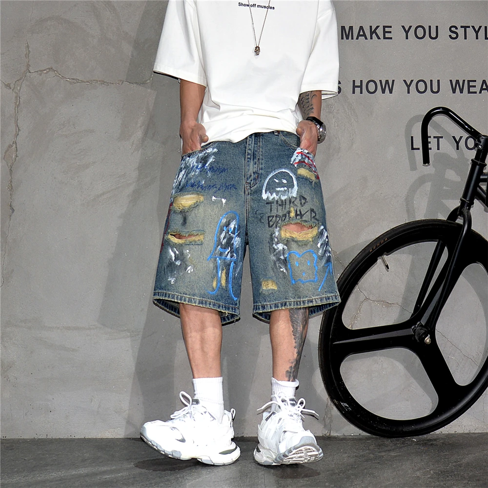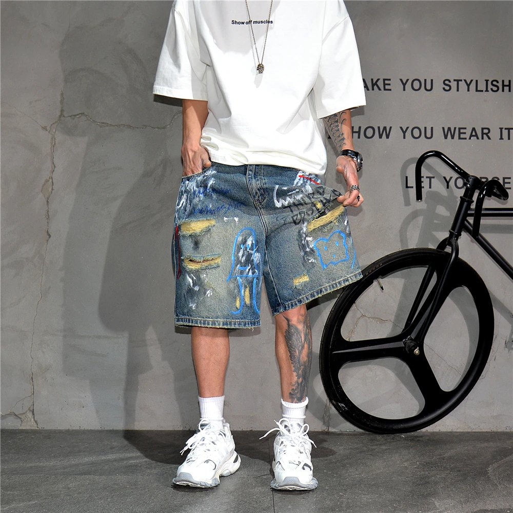 Mens Summer Ripped Distressed Denim Shorts 5 Inch Korean Style Streetwear Hip Hop Graffiti Skate Trendy Mid Blue jorts Male