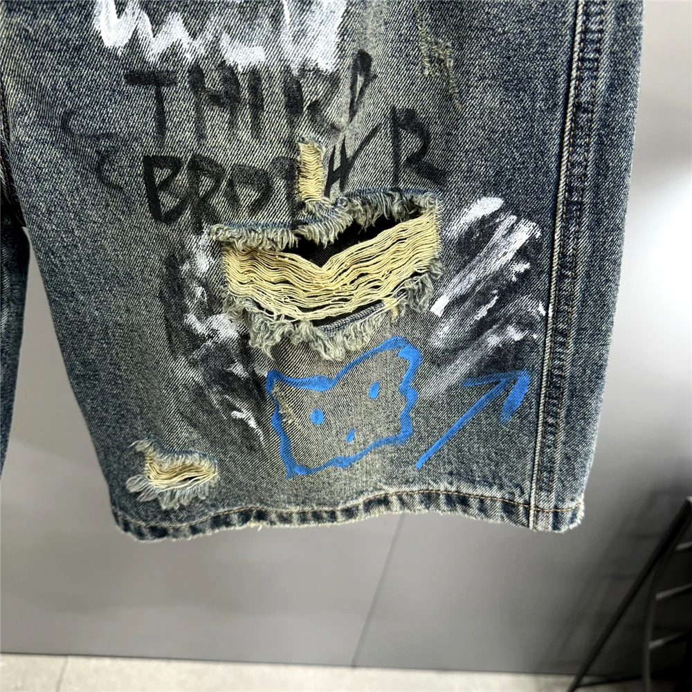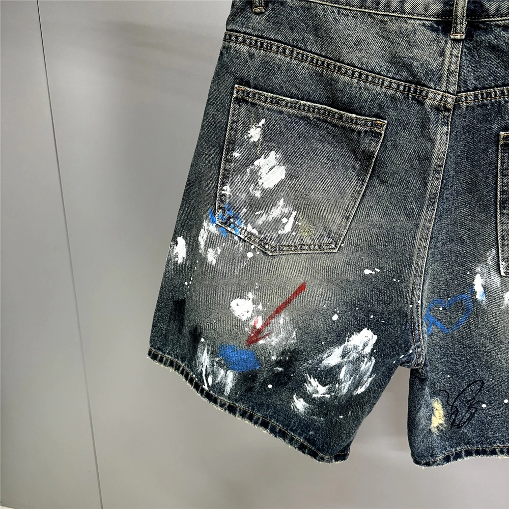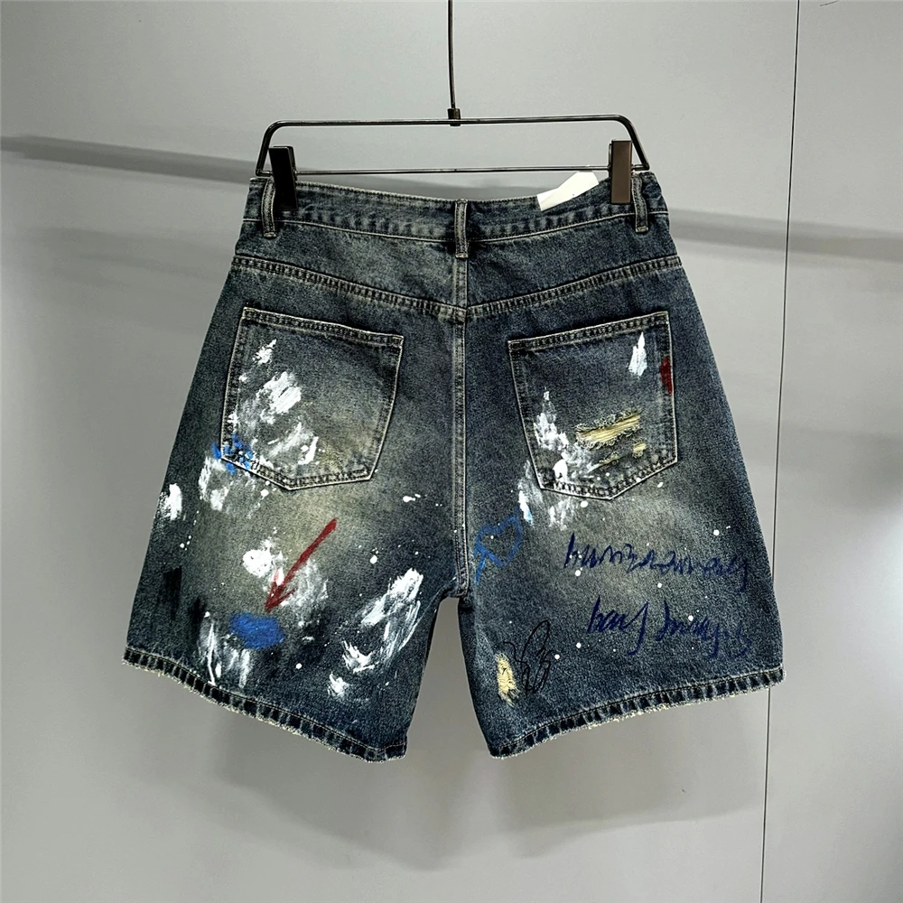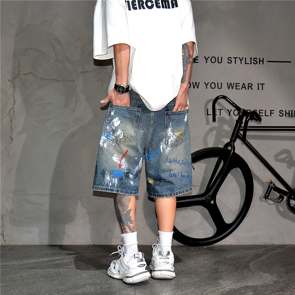 Mens Summer Ripped Distressed Denim Shorts 5 Inch Korean Style Streetwear Hip Hop Graffiti Skate Trendy Mid Blue jorts Male