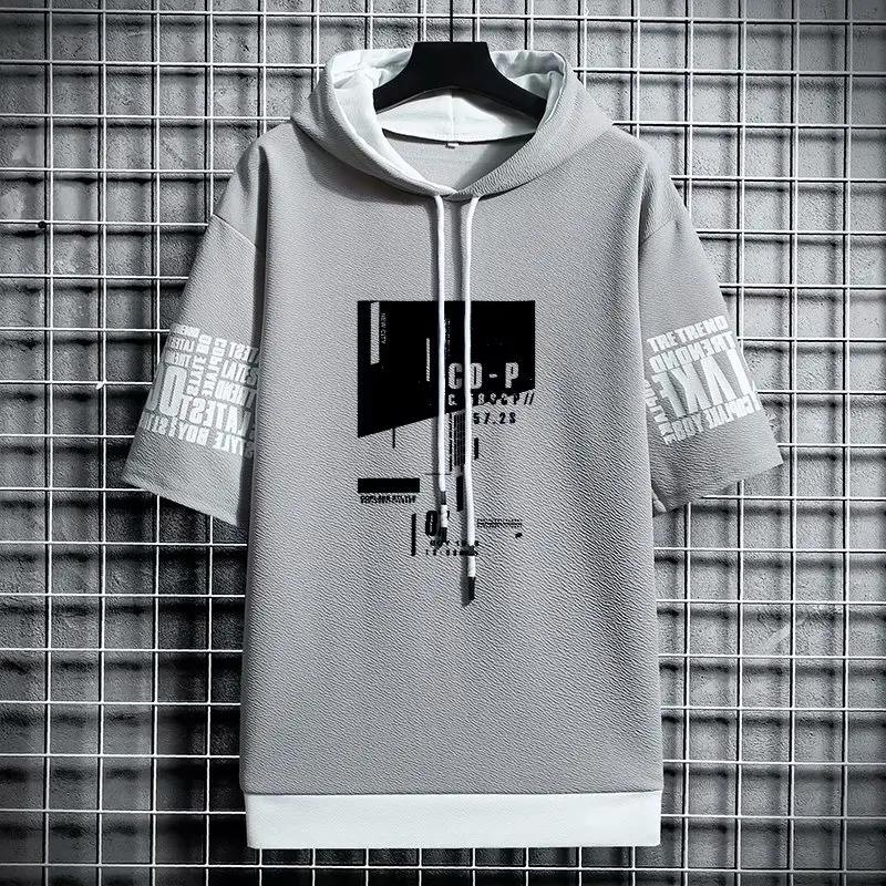 New Korean Style Men's Hoodies Fashion Streetwear Half Sleeve Hooded Sweatshirts Men Casual Harajuku Prints Men Clothing Hoodies