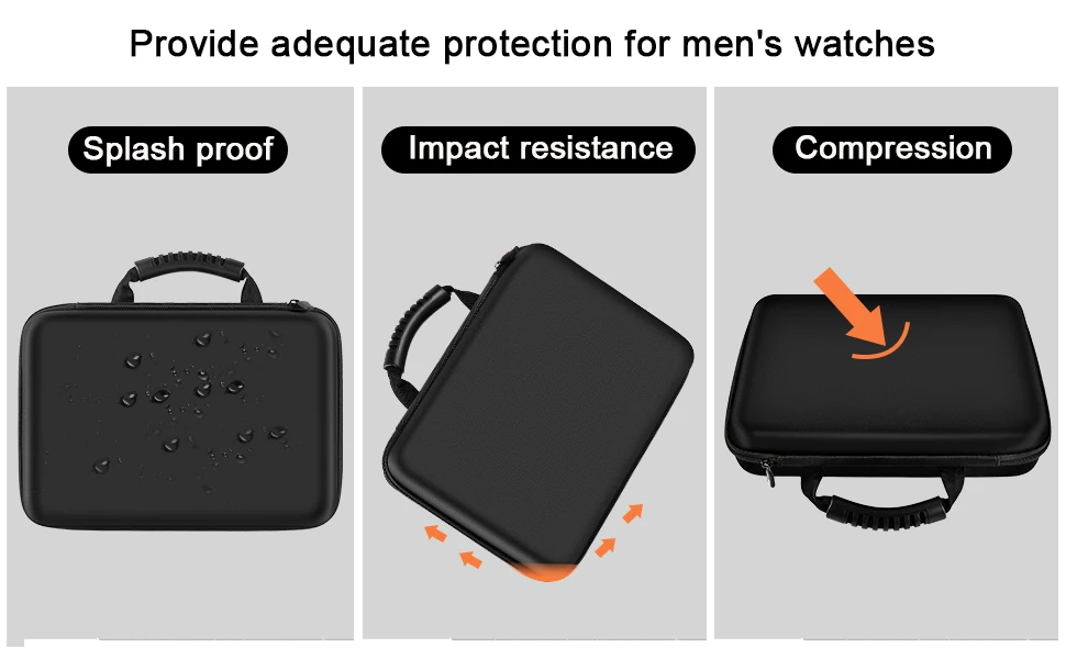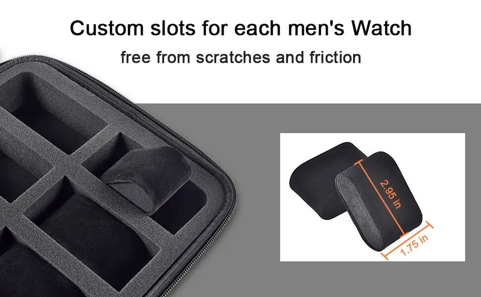 Protective hard watch holder cabinet:Watch organizer box with and strong eva material which is crush resistance, shock resistance, splash-resistance, gives ample protection to men's watches, customized slot for each men's wrist watches with removable foam insert cut fits pillows snugly and will not slide around within the compartment, soft foam protect mens watches against scratches and friction when traveling.